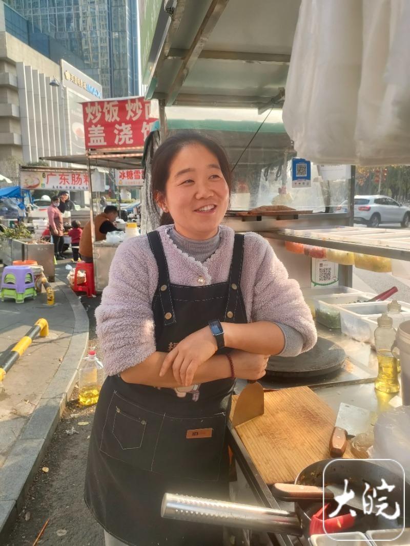 12月10日,邓芳接受了大皖新闻记者的采访,虽然独自抚养患有白化病的女儿,但她乐观充满阳光,“我要传播正能量!不要哭哭啼啼的!”邓芳笑着说,这个简单的煎饼摊,是母女俩的生计来源,更是她们与这座城市对话的窗口。